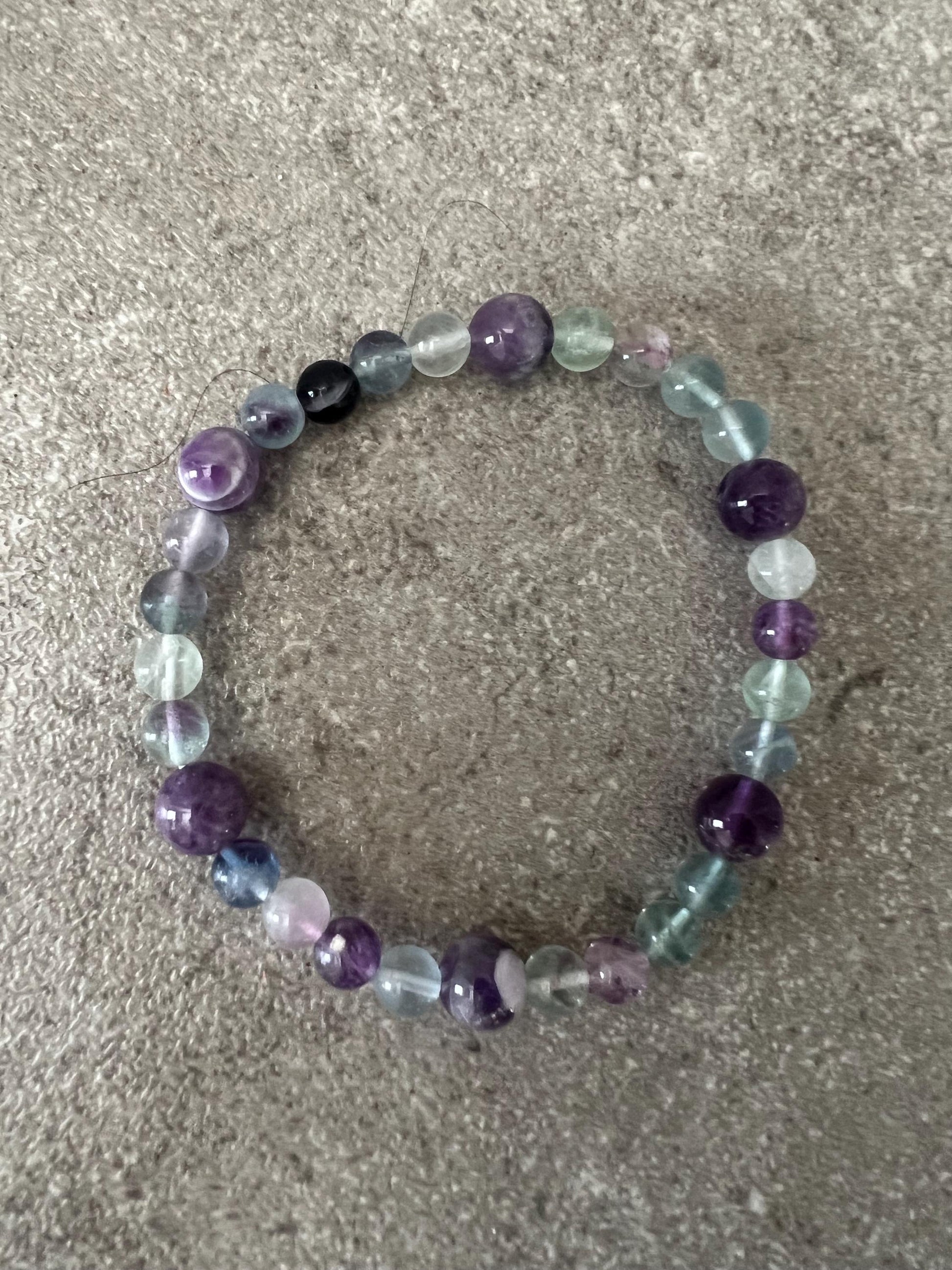 combination of fluorite is 6mm and amethyst 8mm. for a unique style bracelet