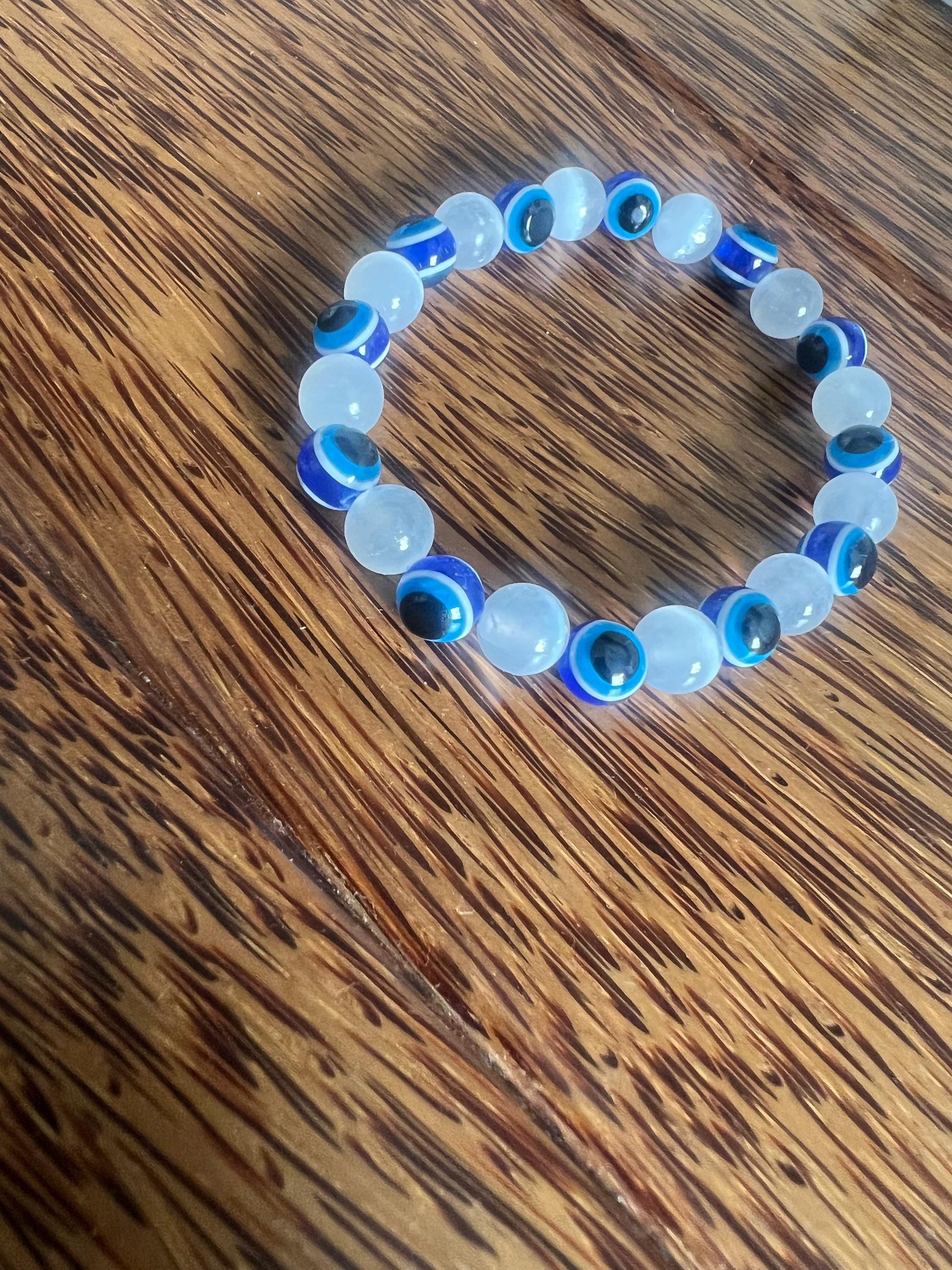 Evil eye and selenite crystal 8mm beads for protection shield, recharge. remove negative energy clearing bracelet