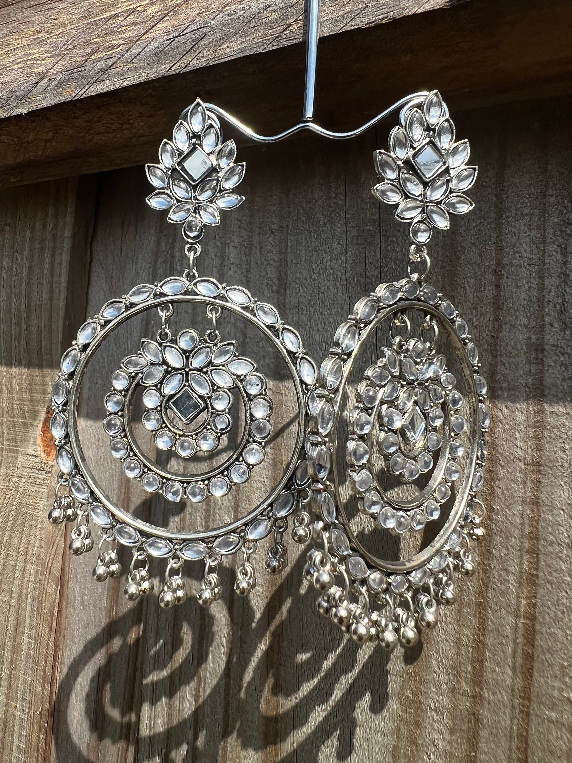 These are gorgeous dazzling mirror and kundan detailing silver look chandbali earrings.